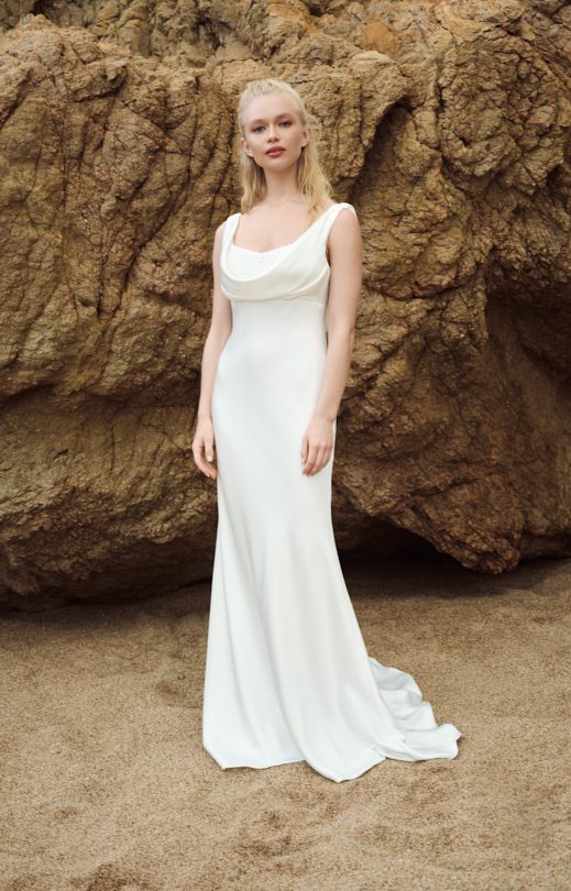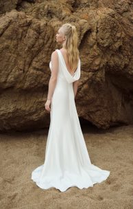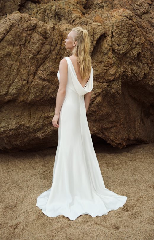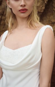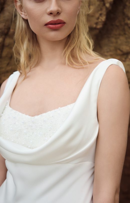 Half-fish silhouette dress is made of silk crepe. The front part of the bodice is decorated with densely beaded guipure embroidered with handmade pearl embroidery. The front bodice is decorated with soft drapery of “swing” type. The back has a deep neckline with a zipper. For additional decoration on the back there is a removable soft drapery swing, which is attached to the shoulders with buttons.