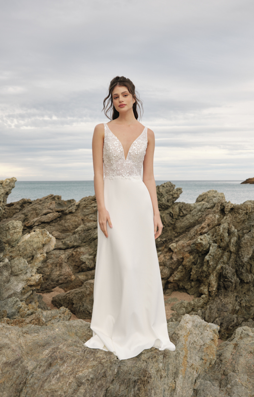 The dress is made of guipure, densely embroidered with sequins and beads, in a harmonious combination with crepe satin. The bodice with a gently dropped waistline on the back gives the silhouette a special femininity. Transparent back is decorated with neat handmade embroidery on the edge and armholes. The clasp on the back is decorated with miniature pearl buttons. The half-skirt smoothly passes into a light plume.