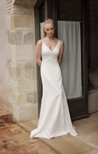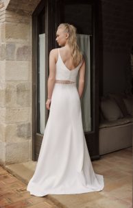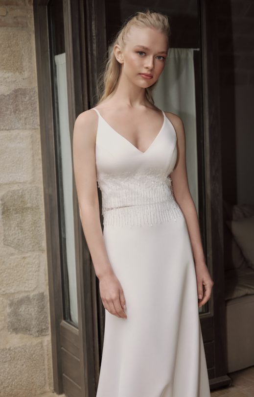 The set is made of mikado-lux. The top is decorated with handmade embroidery of beads, glass beads and faceted beads of different sizes and shapes. The back of the top fastens on delicate pearl buttons. The “half-fish” skirt is fastened at the back with a zipper. The waist line is raised.