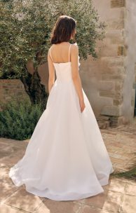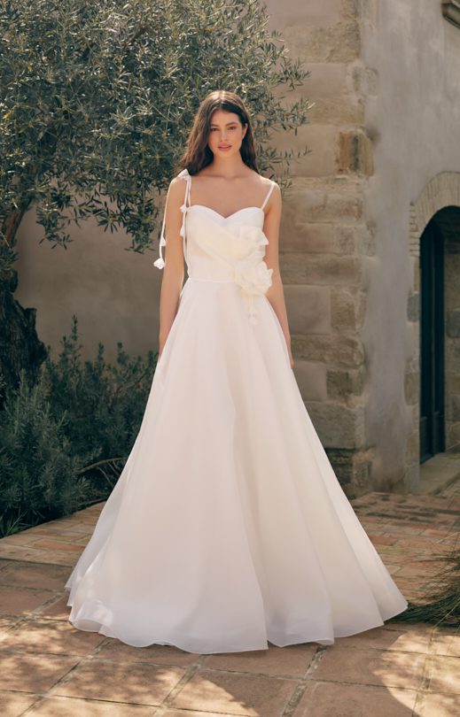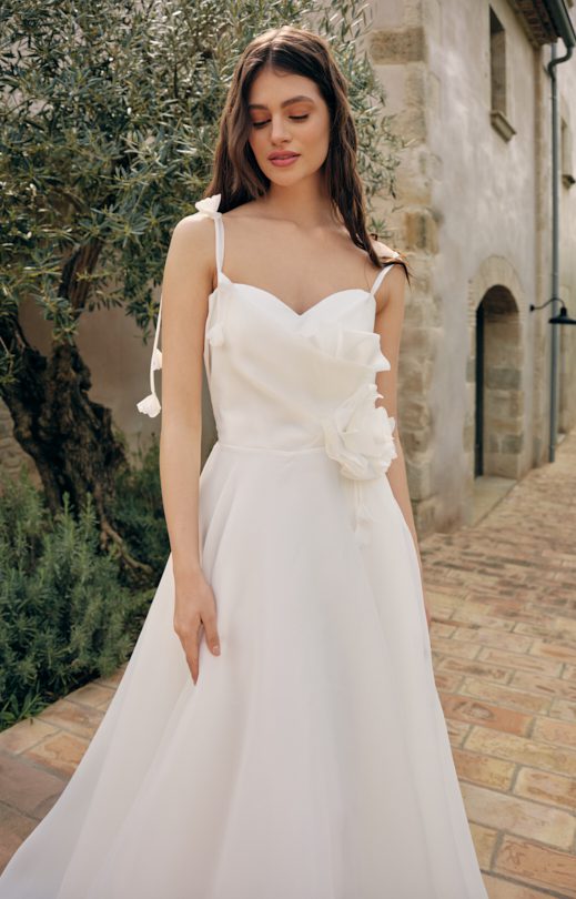 Airy A-silhouette dress with a sun-skirt, made of organza. On the bodice-corset there is an asymmetric drapery, which is complemented by a voluminous handmade decorative flower. On the back there is internal lacing and a machined zipper. Tender little flower buds on the right shoulder strap delicately complete the look.