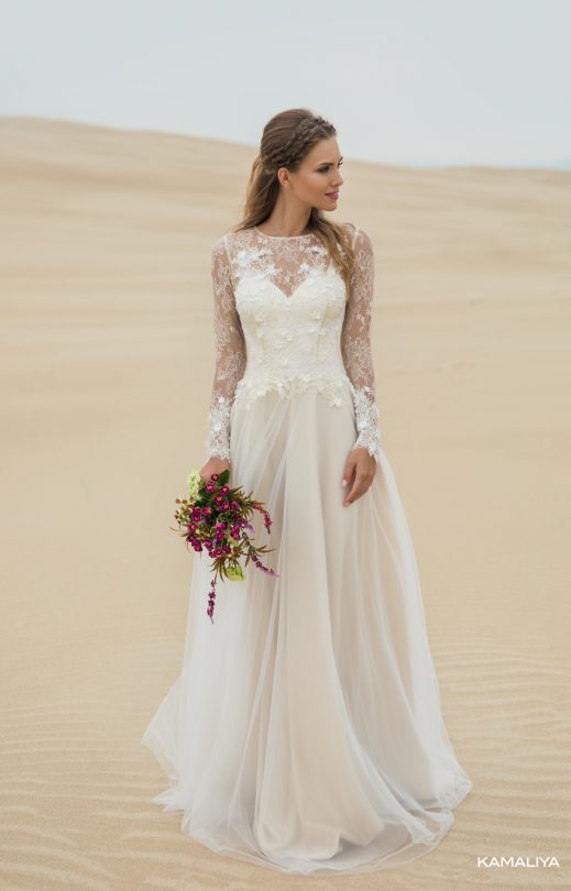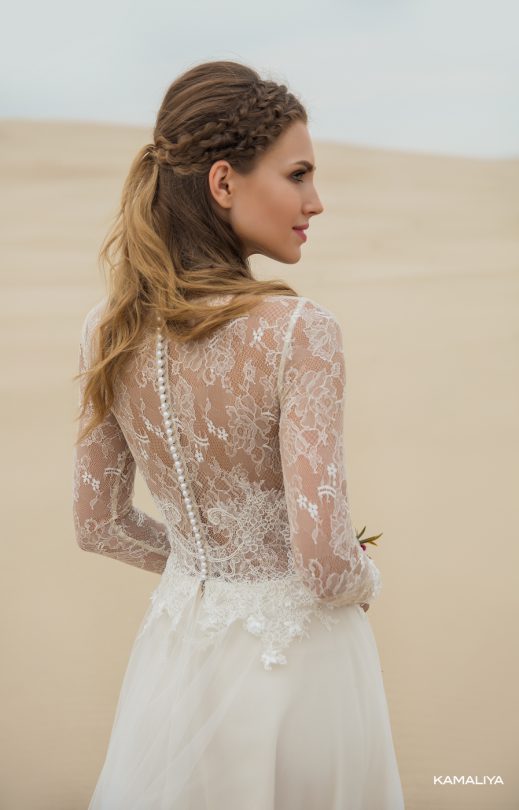 A refined dress of a toned shade is made of Italian guipure and tulle. The most delicate bodice is harmoniously combined with the cord lace elements and the border, which smoothly descend from the bodice to the multi-layered tulle skirt-sun. The back is fastened with button-pearls. The dress is richly decorated with embroidery of handmade flowers, pearls and beads.