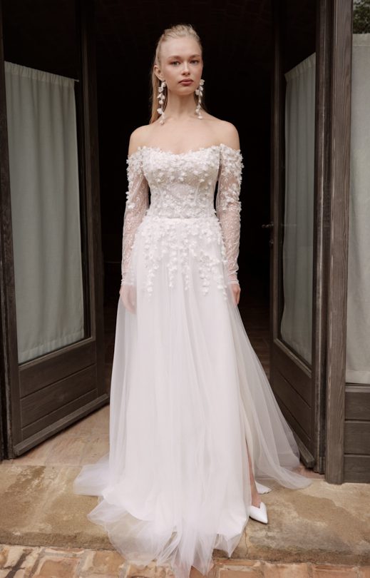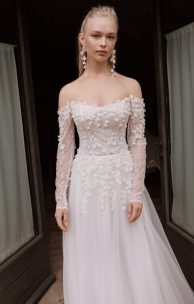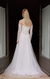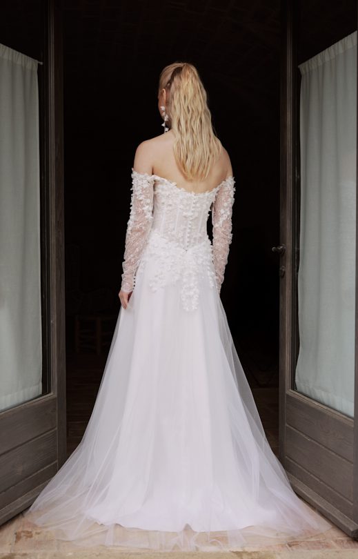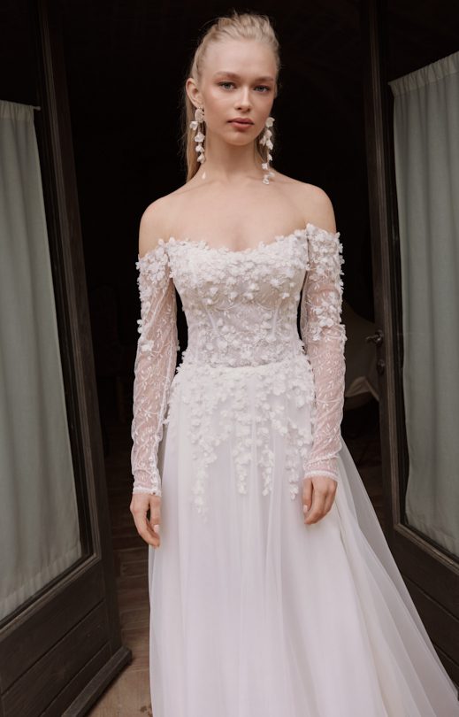 The dress combines different types of fabrics and textures. The bodice is made of thin guipure decorated with voluminous lace elements, sequins and small flowers. The corset bodice with a carmen neckline emphasizes the figure, and the back with a dropped waistline is fixed with a clasp on pearl buttons. Narrow long sleeves made of guipure end with the same buttons. The multi-layered tulle sun skirt with lace details gives the dress lightness and airiness, with a slit on the left side.