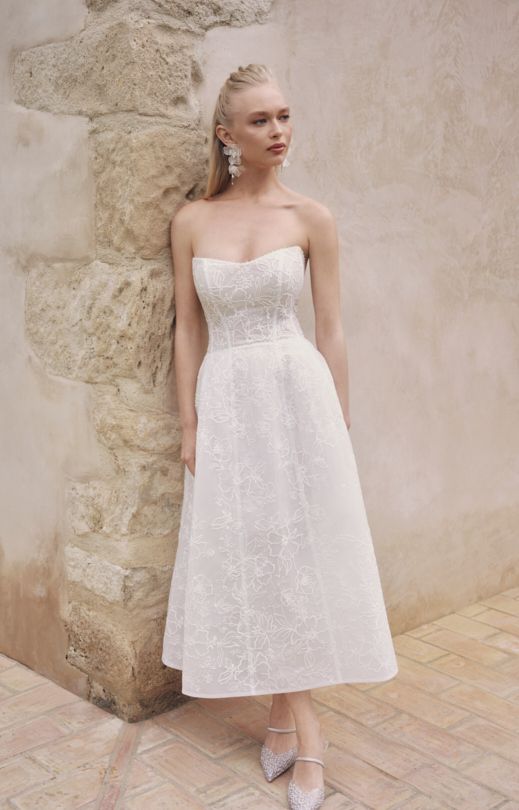 Dress made of light guipure with elegant floral pattern is emphasized by a corset up to the waistline. The back is decorated with a convenient zipper. Lace edging decorates the upper edge of the dress. A stiffening strap on the lower edge of the skirt provides a neat shape.