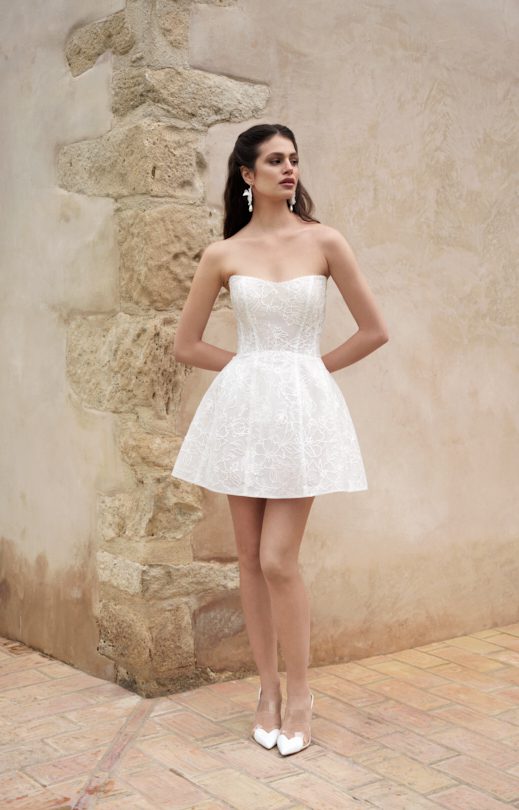Short dress made of light guipure with elegant floral pattern is emphasized by corset up to the waist line. The back is decorated with a convenient zipper. Lace edging decorates the upper edge of the dress. A stiffening strap on the lower edge of the skirt provides a neat shape.