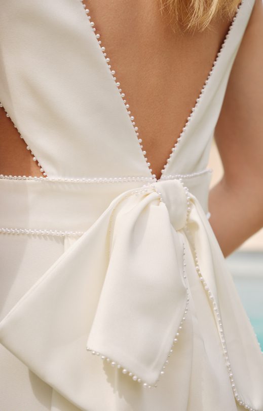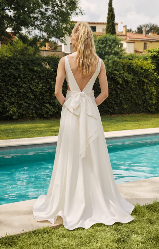 A-silhouette dress is made of mikado-lux. The front and back of the bodice are decorated with shaped undercuts, the edges of which are decorated with exquisite handmade embroidery. The waist is accentuated by a wide belt with a carved edge, which is decorated with embroidery of small pearls. The back of the dress has a button closure. The skirt is flared and has a slit on the left side. Soft pleats at the waistline add volume, and side pockets provide comfort. It comes with a removable bow, which is attached with buttons on the back to the waistband, also decorated with handmade embroidery.