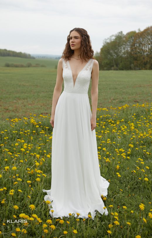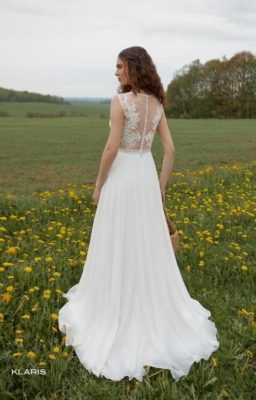 Sophisticated dress with a relaxed silhouette made of chiffon, combined with dotted tulle and lace trim. The soft top with a V-neckline at the front and back is covered with dotted tulle and decorated with cord lace elements and a mother-of-pearl button closure. The delicacy of the waist is emphasized by a lace edge that imitates a belt. A light sun skirt rounds off the delicate dress.