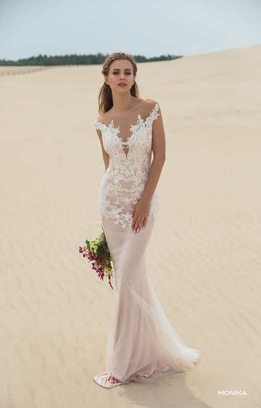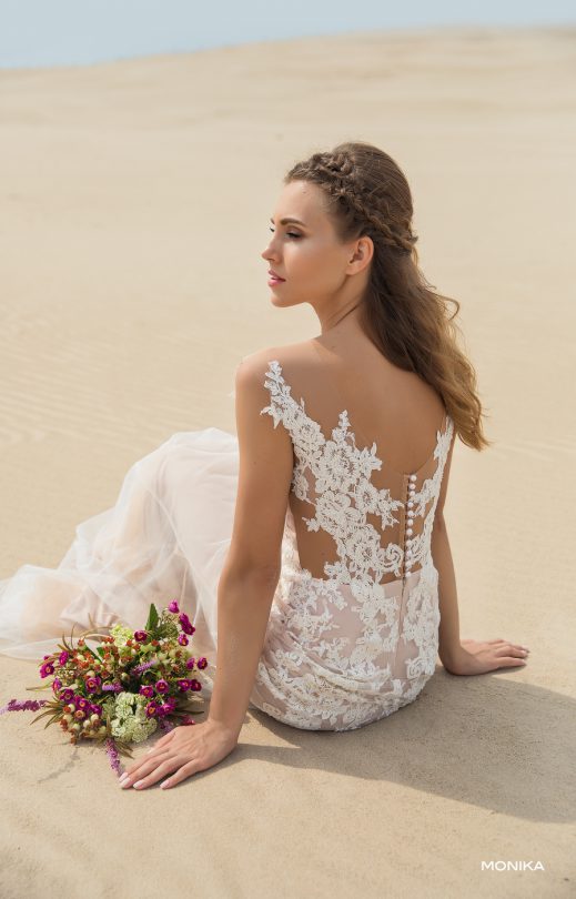 A fascinating dress “fish”, a transparent tulle back and a bodice are densely covered with cord lace. A deep V-neckline is accentuated by lace elements, on the back is a row of tender pearly buttons. The tenderness of the image creates a trembling deflated shoulder line and a multilayer flowing tulle skirt, the top of which is covered with lace elements.