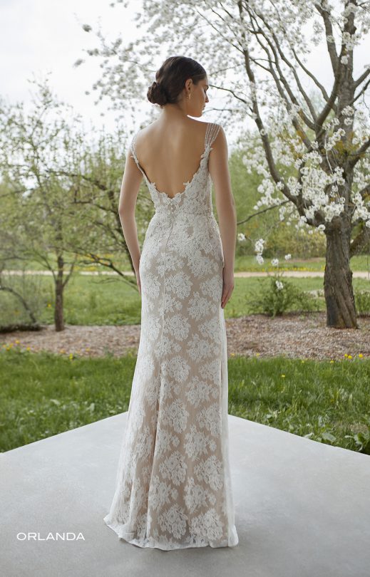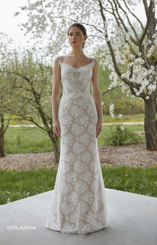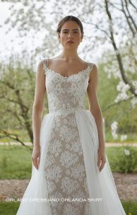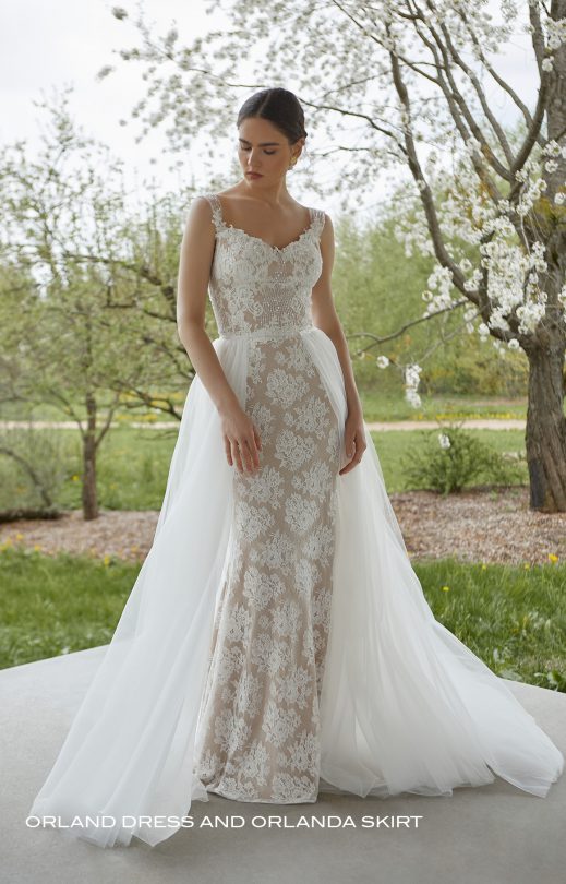 Delicate dress with silhouette “Fish” is made of guipure in combination with embroidered lace elements and decorated with handmade embroidery with pearls and sequins. The front neckline has the shape of a touching heart, on the back there is a rounded cut to the waist. The wide tulle straps are hand-embroidered. A detachable, fluffy multilayered tulle skirt with a train with a cut on the front is recommended in the set for the dress.