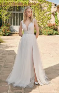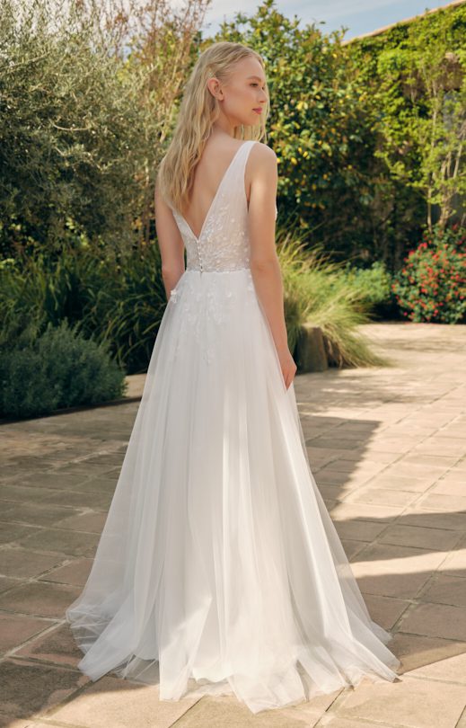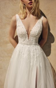 Refined A-silhouette dress is made of flowing silk tulle combined with lace elements and handmade embroidery of small flowers. The bodice of the dress, draped with soft silk tulle, fastens on the back with pearl buttons. The multi-layered skirt has a slit in front on the left side, with a small gathering at the waistline. The bottom layer of the skirt is decorated with lace elements. The upper part of the skirt is decorated with small flowers, embroidered by hand and giving the dress a special charm.