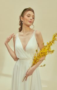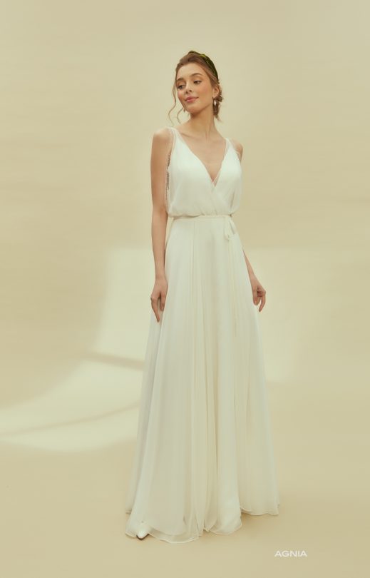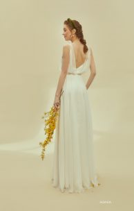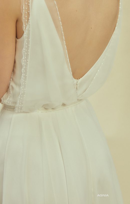 Exquisites Kleid aus Seidenchiffon, fliegend, leicht, luftig. Am Oberteil fließen weiche Drapierungen, die an den Rändern durch dünne, zarte Stickereien mit Signalhörnern und kleinen Perlen ergänzt werden. Weicher Rock mit einem Schlitz auf der linken Seite. Beinhaltet einen Seidenchiffongürtel, der an einer Schleife befestigt ist. An den Enden befinden sich Perlenbürsten. Der Gürtel ist auch mit kleinen Perlen bestickt.
