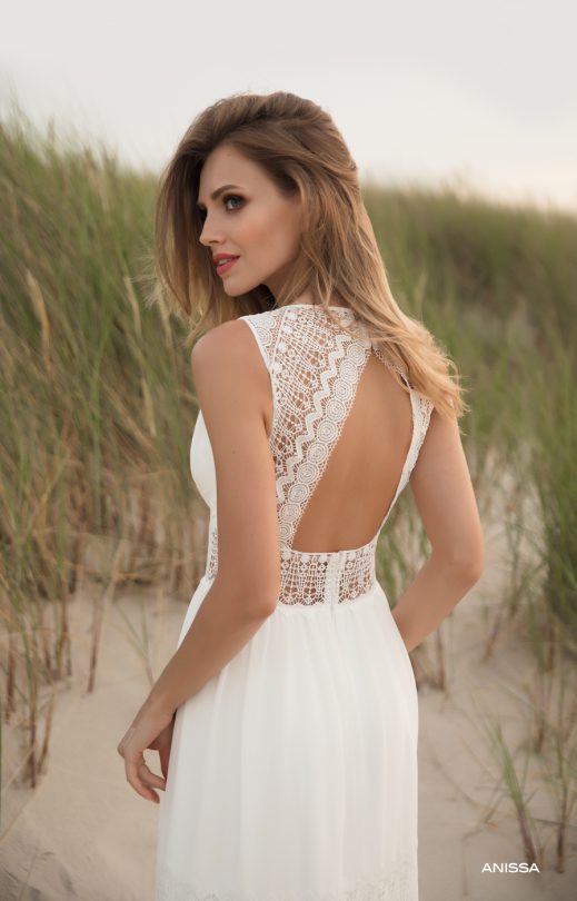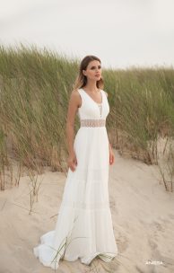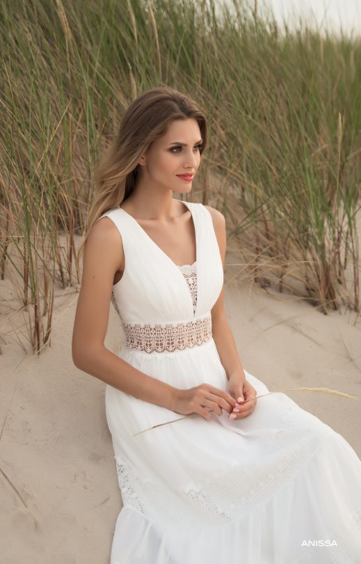 Ein atemberaubendes Kleid im Boho-Stil. Leicht, zart, aus Chiffon in Kombination mit Baumwollspitze. Ein weiches Oberteil mit leichter Drapierung und einem tiefen V-Ausschnitt und einem Guipure-Einsatz mit Keil. Besonders interessant ist das ungewöhnliche Design der Rückenlehne, im Halsbereich eine Schließe mit Perlenknöpfe. Besonderes Augenmerk wird auf einen mehrstufigen Rock gelegt, bei dem jede Ebene durch Guipure-Einsätze getrennt ist.