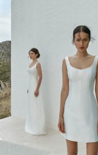 Kurzes Kleid aus Mikado in taillierter Silhouette mit gerippten Linien vorne und hinten. Auf der Rückseite ist ein Reißverschluss.