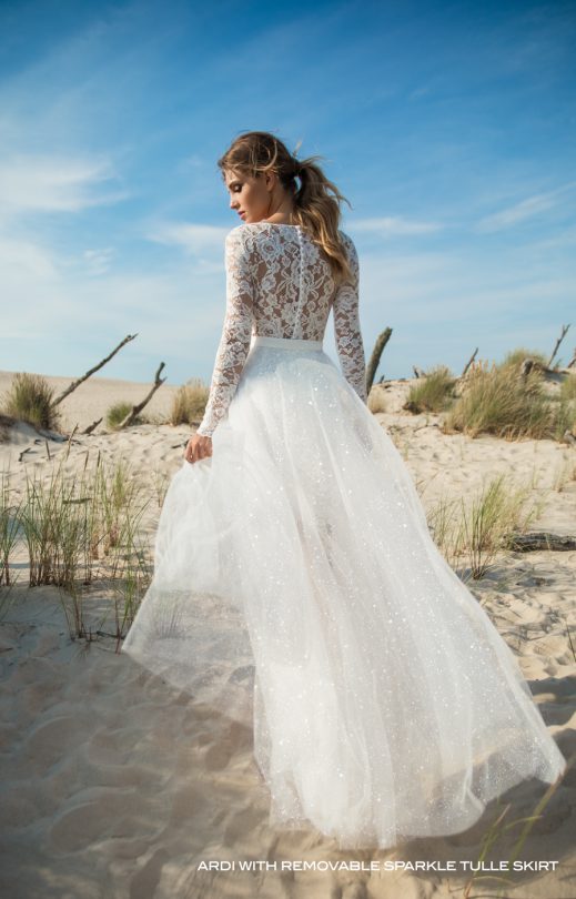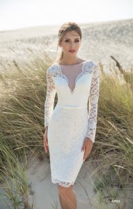 Elegantes Kleid einer benachbarten Silhouette der Länge bis zum Knie ist aus Cord Guipure geschaffen. Die Kanten der femininen V-Ausschnitt sind mit Spitze geschnitten, der Guipure-Rücken ist mit Perlknöpfen befestigt.