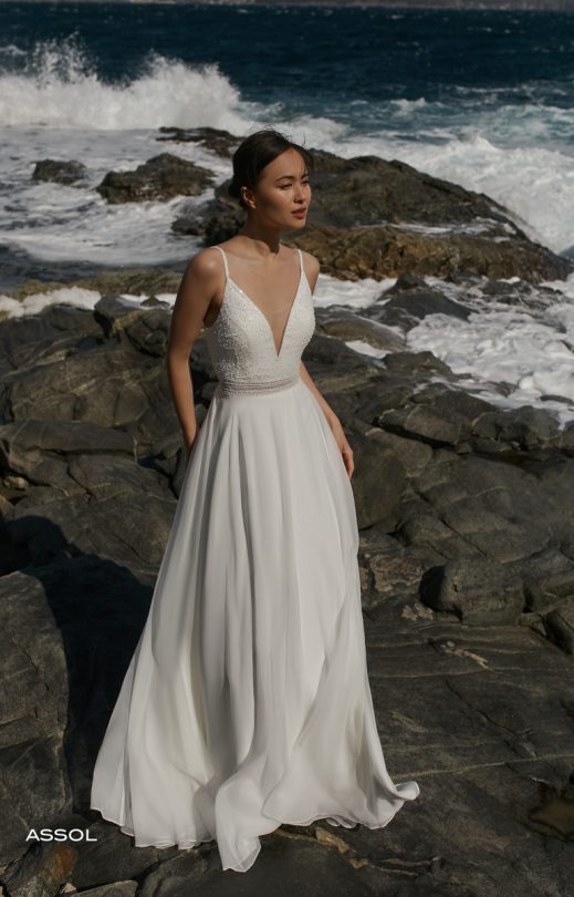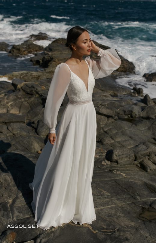 Das Kleid mit Rock-Sonne besteht aus Seidenchiffon kombiniert mit Guipure-Spitze, die mit kleinen Perlen bestickt ist. Das Mieder mit tiefen V-förmigen Ausschnitten vorne und hinten an dünnen Trägern ist mit Guipure bedeckt. Im Mieder ist ein transparenter Gürtel mit zwei Arten von Spitzenborten und handgefertigter Stickerei mit kleinen Perlen verziert. Auf der Rückseite befindet sich eine Schließe mit Perlmuttknöpfen. Das Set kann abnehmbare weite Ärmel aus Seidenchiffon mit einer schmalen transparenten Manschette enthalten, die mit einer Spitzenborte und Perlenknöpfen verziert ist.