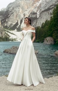 Ein sehr feminines Kleid aus dem italienischen Mikado mit einem besonderen Charme. Auf der abgesenkten Nahtlinie des Rocks befindet sich ein schmaler Gürtel. Auf der Rückseite der femininen Schnürung. Luxuriöser Rock mit breiten Falten, ergänzt durch Taschen in den Seitennähten.