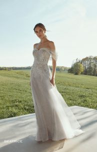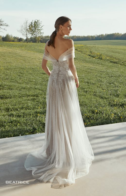 Exquisites Fisch-Silhouette-Kleid besteht aus einer Kombination von Stoffen unterschiedlicher Texturen. Das anmutige Mieder-Korsett ist mit Guipure überzogen, dicht mit Pailletten bestickt und mit zarten Spitzenelementen mit Chiffonblüten verziert.Am oberen Rand des Mieders befindet sich eine zarte Tüll-Einfassung. Zusätzlich sind auf die Schultern fallende Tülldrapierungen befestigt. Der Rock ist mehrschichtig: der untere Rock „Fisch“ aus Tüll mit Pailletten bestickt, mit Spitze verziert, mit Pailletten und Spitzenelementen mit Chiffonblüten bestickt; der oberer Rock-Sun aus Tüll unterstreicht die Raffinierte des Bildes.