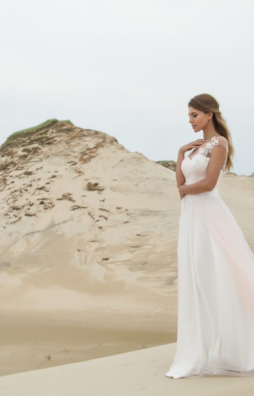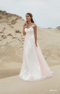 Unglaublich feminines Kleid mit einem getönten puder Farbton mit zarten handgemachten Blumen und Perlenstickereien, die vom Oberteil bis zum vielschichtigen Rock-Sun reichen. Die Luft des Mieder wird durch eine asymmetrische Draperie aus Tüll und eine Tüllkotette in Nude verliehen, der charmante Ausschnitt des Korsetts ist in Form eines Herzens und der Rücken mit einer femininen Schnürung, die dem ganzen Modell einen besonderen Charme verleiht.