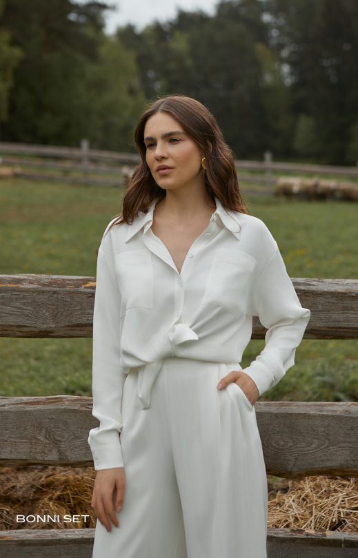 Modernes Set aus Viskosestoff, bestehend aus Hemd und Hose. Relaxed Fit Hemd, abgesenkte Schulterlinie, Knopfverschluss vorne. Aufgesetzte Taschen im Brustbereich, Hemdkragen. Auf der Rückseite befindet sich eine Passe und der untere Teil des Rückens mit einer weichen Falte. Hose in freiem Schnitt mit Bundfalten vorne im Taillenbereich, mit Taschen und Gürtel, die Passform der Hose ist hoch.
