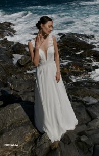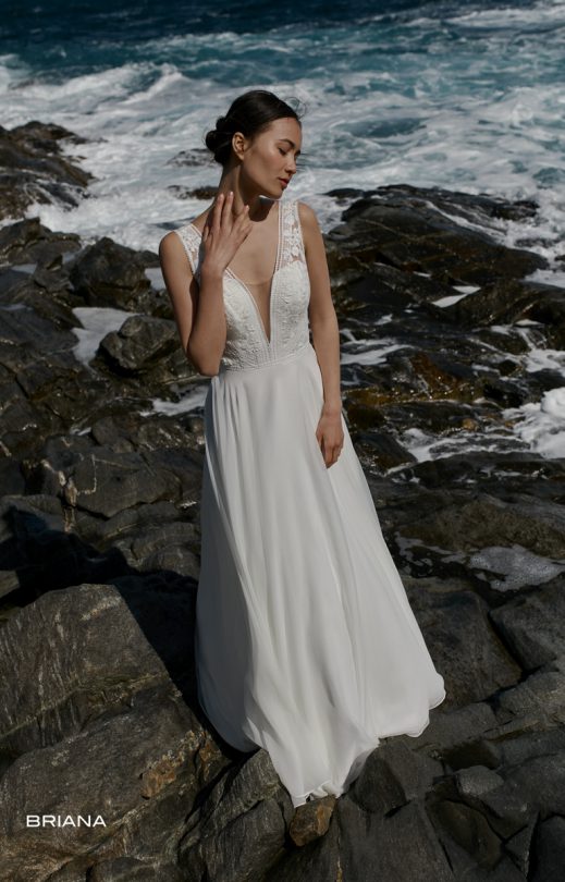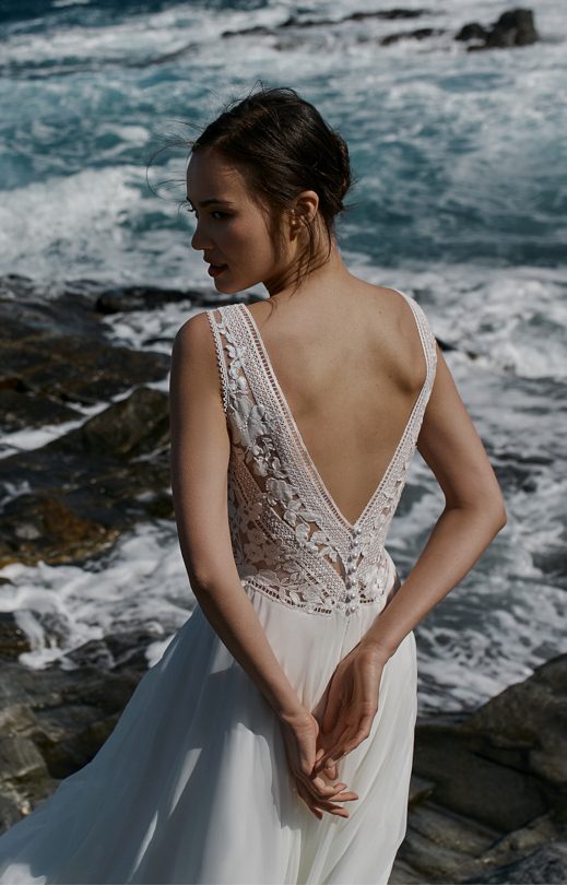 Das Kleid besteht aus Stoffen mit unterschiedlichen Texturen: Mieder aus weicher Baumwollspitze mit Blumendruck kombiniert mit Baumwollspitzenbesatz. Rock ist aus Seidenchiffon. Auf der Rückseite befindet sich eine Schließe mit Perlmuttknöpfen.