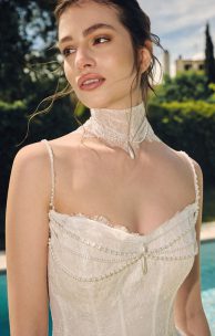 Der Choker ist aus feiner Spitze gefertigt und wird mit Perlenknöpfen geschlossen. Die Breite des Chokers beträgt 8 cm.