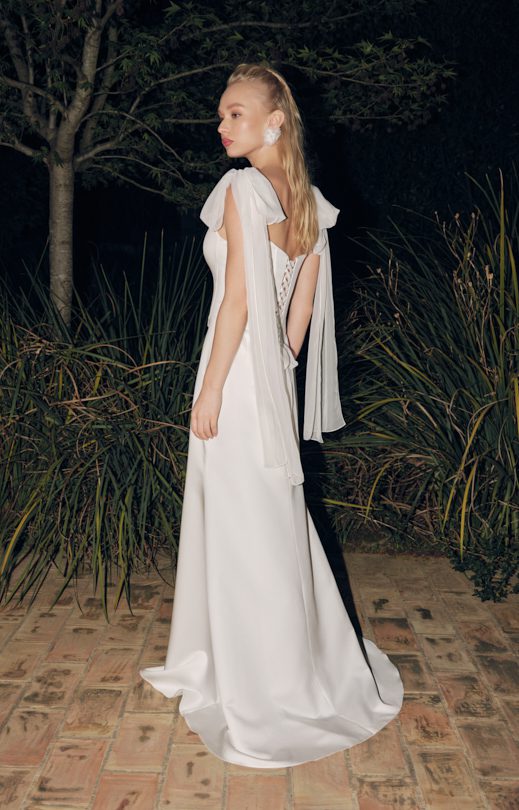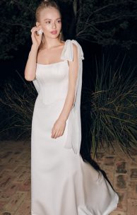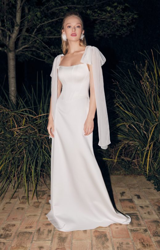 Das Korsett ist aus Satin gefertigt. Auf dem Rücken befindet sich eine Schnürung durch Schlaufen. Seidenchiffonbänder verleihen dem Bild Leichtigkeit und werden an den Armausschnitten mit Knöpfen befestigt.