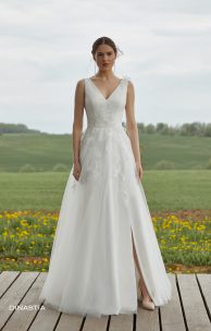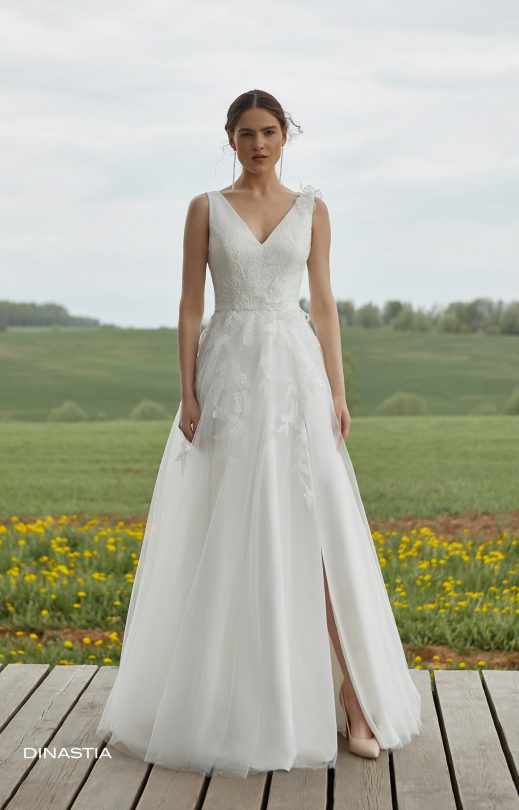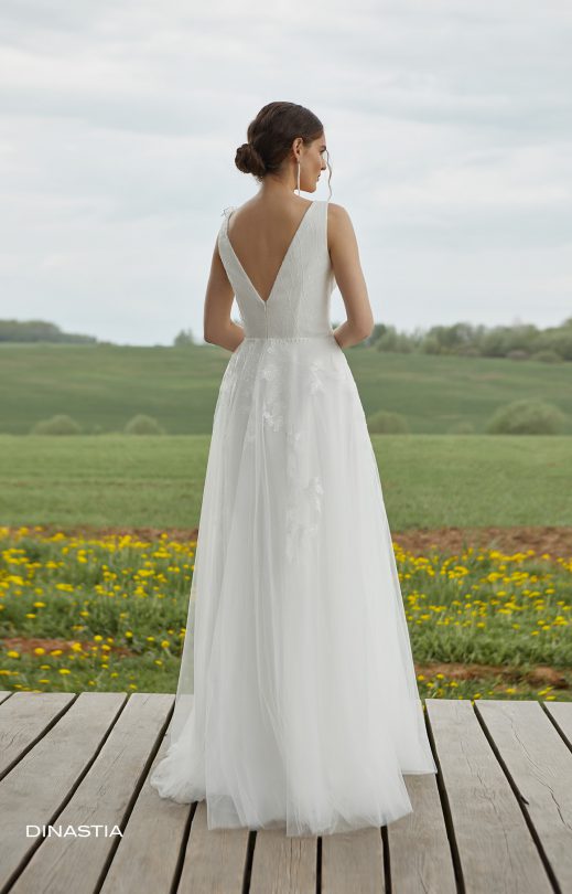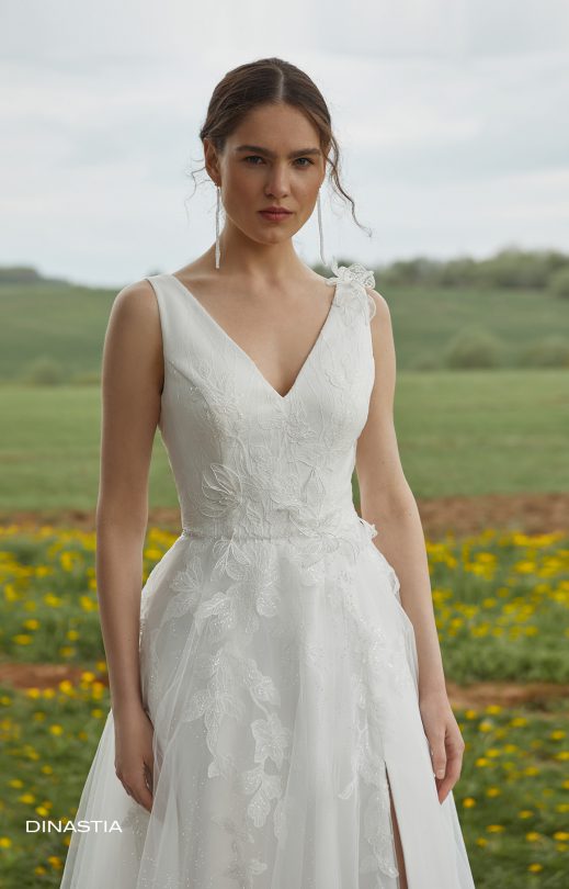 Feminines Kleid in A-Linie. Das feminin weiche Mieder des Kleides mit V-förmigen Cut-Outs vorn und hinten ist mit zarten Spitzenelementen verziert, die mit Pailletten bestickt sind. Auf der Rückseite befindet sich ein Reißverschluss. Der Rock ist mehrlagig aus Tüll, auf dem Spitzenelemente vom Mieder herabsteigen. Das Dekor des Kleides wird durch voluminöse handgefertigte Spitzenblumen ergänzt.