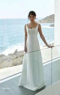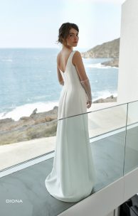 Das Kleid in A-Linie ist aus Mikado. Figurenreliefs auf Vorder- und Rückseite. Rock unten ist mit Versteifungsband abgeschlossen. Auf der Rückseite befindet sich ein Reißverschluss.