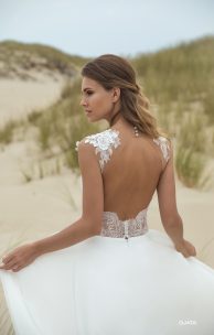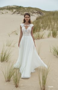 Elegantes Kleid ist aus einer unerwarteten Kombination von Guipure-Mustern verschiedener Strukturen und einem zarten Seidenchiffon an einer Rock-Sun gemacht. Das Oberteil ist mit der feinsten Guipure-und Kordelblume bedeckt, die mit Stickereiperlen handgemacht ist. Die Schulterlinie ist zitternd entleert, die Guipure-Blüten bedecken sanft die Schultern und folgen dem Hals, was ein unvergessliches Merkmal dieses Modells schafft.