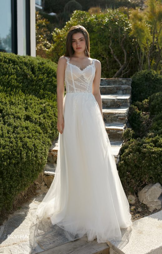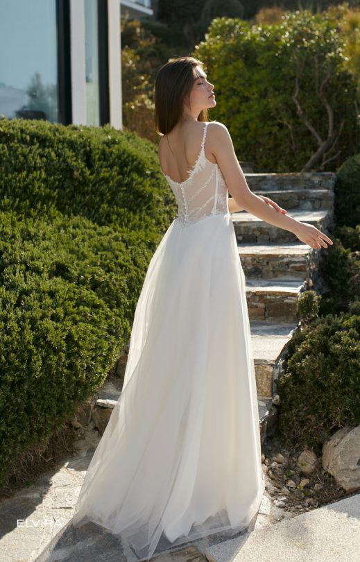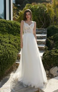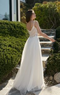 Das Kleid in A-Linie besteht aus Tüll in Kombination mit floral bedruckter Guipure. Guipure ist leicht mit kleinen transparenten Pailletten bestickt. Mieder ohne Unterstoff, mit Cups. Der Rücken ist leicht verlängert und mit Perlmuttknöpfen befestigt. Das Mieder ist an dünnen Trägern, ist mit Spitzenelementen verziert. Der Sonnenrock ist mehrlagig, die oberste Schicht ist mit Spitzenelementen verziert.