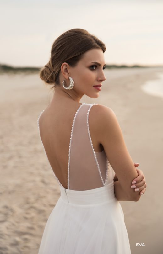 Unglaublich zierliches Kleid aus italienischem Tüll. Cups des Mieder und ein breiter Gürtel sind mit Tüll drapiert. Die Ränder der tiefen V-förmigen Ausschnitte vorne und hinten und die Keile an den Seiten sind mit kleinen Perlen handgestickt. Die Leichtigkeit des Kleides wird durch die vielschichtige Rock-Sun betont.