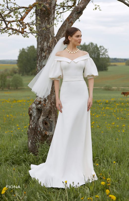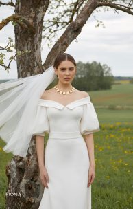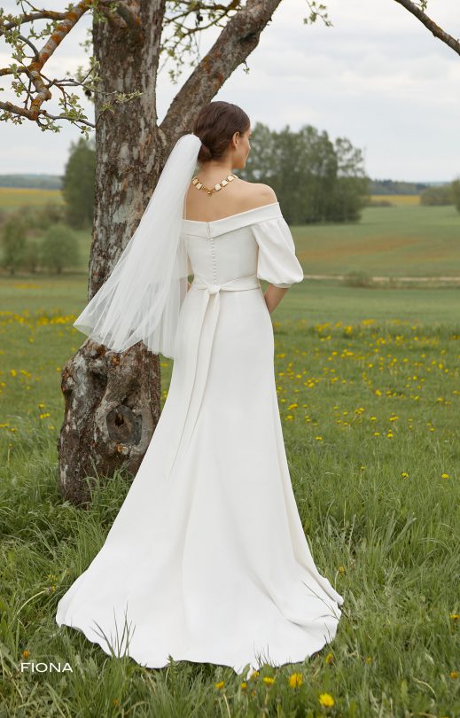 Elegantes Fisch-Silhouette-Kleid aus Matis. Ausschnitt „Carmen“ Mieder mit femininer Schulterlinie, entlang dem ein weiches Revers, 3/4-lange Puffärmel mit Bündchen unten. Der Rock mit einem kleinen Zug. Enthält einen weichen abnehmbaren Gürtel, der mit einer Schleife gebunden ist.