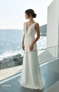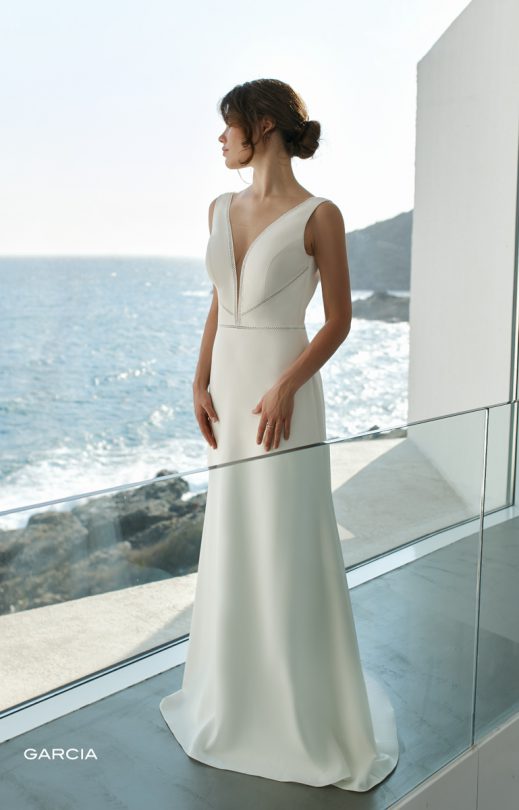 Das Kleid der passenden Silhouette „Fisch“. Aus Crêpe-Satin, in geprägten Nähten und an der Taille mit Zierborte. Auf der Rückseite befindet sich ein Reißverschluss, an dem dekorative Knöpfe angenäht sind, die mit Stoff überzogen sind.