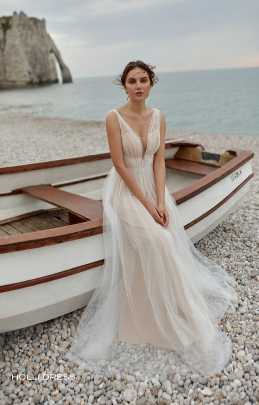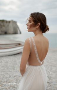 Das Kleid ist aus Seiden-Tüll. Die Vorderseite des Mieders ist mit Vorhängen und handgefertigter Stickerei auf Tüll mit Perlen und Pailletten verziert. Die Rückseite ist ebenfalls mit handgefertigter Stickerei verziert. Perlmuttknöpfe auf der Rückseite. Lagenrock mit Raffungen an der Taille.