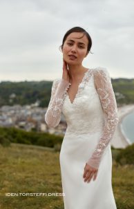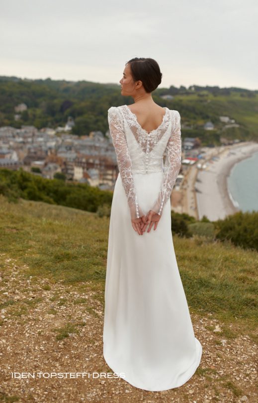 Das Oberteil ist aus dünner, mit kleinen Pailletten bestickter Guipure, kombiniert mit Spitzenelementen mit Chiffonblumen. Lange, schmale Ärmel mit Raffungen und Saum mit Perlmuttknöpfen.