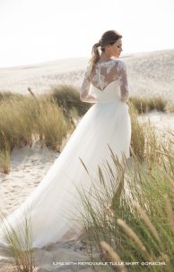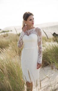 Das zierlichste Kleid der Länge bis zum Knie besteht aus einer eleganten Guipure. Die Basis des Miederes mit einem ausgeschnittenen Herz wird ergänzt durch eine Zecke mit Spitzenbordüre entlang der oberen Guipure-Schicht, die dem Modell eine besondere Raffinesse verleiht.Die Rückenlasche wird an einer Reihe von Perlenknöpfe befestigt und geht nahtlos in den Reißverschluss am Rücken über. Die Taille wird durch ein dünnes abnehmbares Band betont.