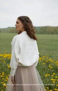 Stylische Jeansjacke, lockerer „Fledermaus“-Schnitt, Druckknopfverschluss, hohe Bündchen mit Druckknöpfen an den Ärmeln. Unten befindet sich die Leiste mit Gummizug hinten. Die Rückseite ist mit handgemachter Stickerei verziert. Länge unterhalb der Taille.