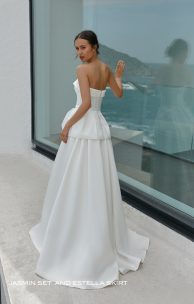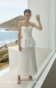Das Set besteht aus Mikado. Korsett mit Schößchen, das entlang der Taille geschnitten ist, mit einem Ausschnitt vorne. Auf der Rückseite befindet sich eine interne Schnürung im Korsett, ein Verschluss mit Perlmuttknöpfen. Der Rock ist gerafft, mit einem Verschluss an 2 verdeckten Knöpfen. Ffalten vorne und hinten, Taschen in den Seitennähten. Auf dem Unterteil des Rockes das Band der Starrheit.