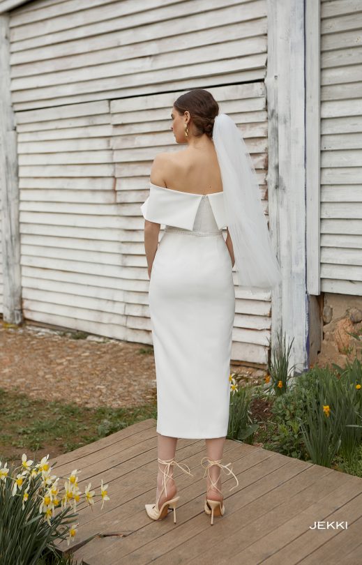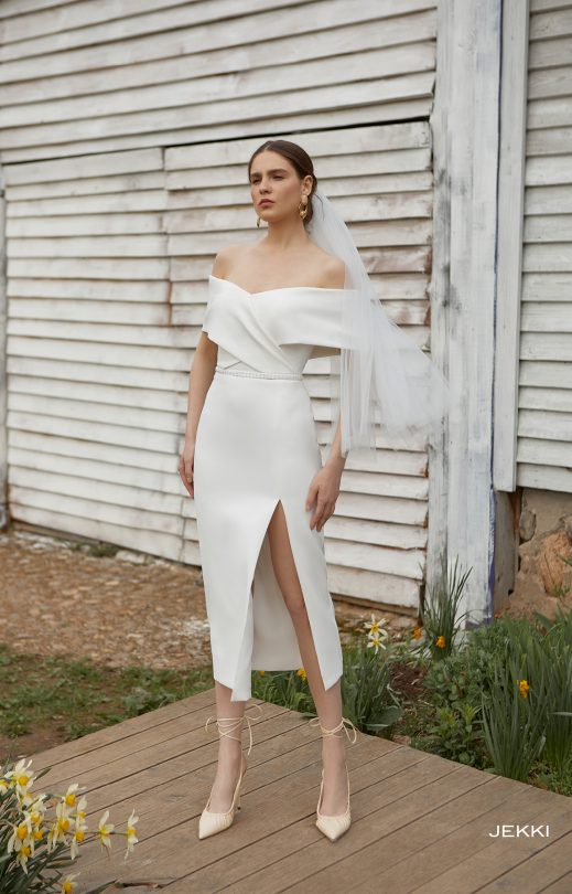 Elegantes Kleid ist aus Matis gefertigt das sich der Silhouette anpasst. Am Ausschnitt ein aufregender Carmen-Ausschnitt mit weichem Faltenwurf, der bis zu den Schultern reicht. Reißverschluss auf der Rückseite. 3/4 langer Rock mit linkem Schlitz. Enthält einen gepolsterten abnehmbaren Gürtel.