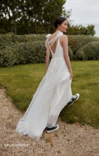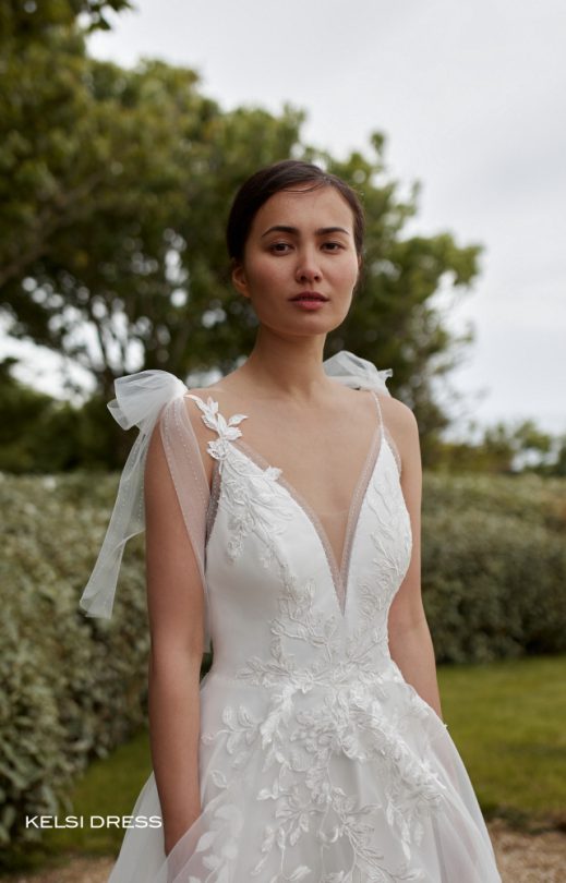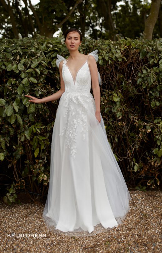 Das Kleid ist aus Tüll gefertigt, verziert mit zarten Spitzenelementen am Mieder und am mehrlagigen Rock. Entlang des Ausschnitts des Mieders und der Taille handgefertigte Stickerei mit Perlen und Kristallperlen. Beinhaltet abnehmbare Tüllschleifen mit handgefertigter Stickerei. Auf der Rückseite befindet sich eine Schließe mit Perlmuttknöpfen.