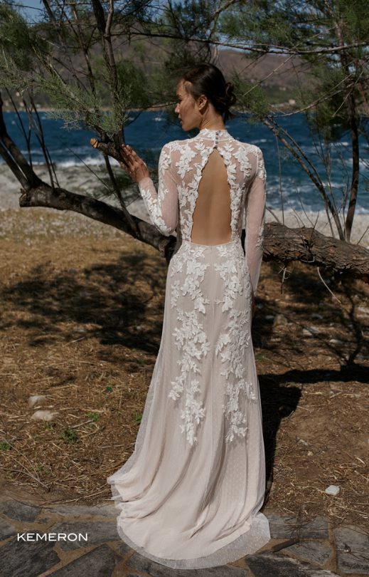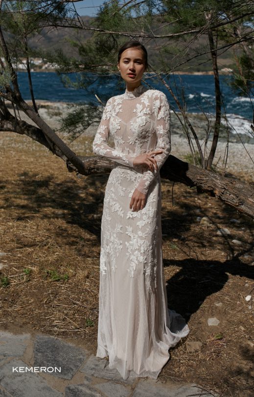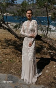 Das Kleid der passenden Silhouette „Fisch“ ist aus weichem Strickstoff, Grops-Tüll, verziert mit Baumwollspitzenelementen, die leicht mit transparenten Pailletten bestickt sind. Vorderes Mieder-transparentes Korsett mit Cups. Ärmel von unten mit einem Verschluss an Knöpfen-Perlen.