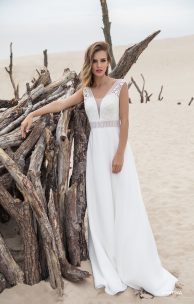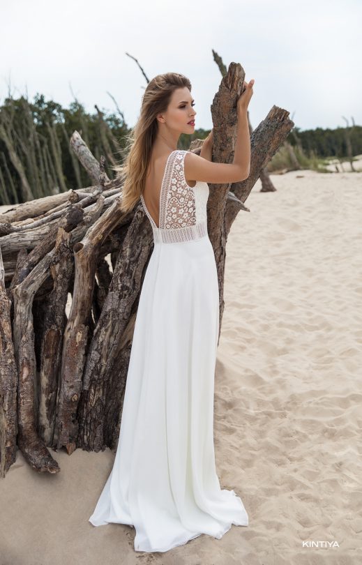 Ein berührendes Kleid im Boho-Stil aus Baumwollguipure auf einem Mieder und Chiffonrock-Halb-Sun. Ein zartes Guipure-Oberteil mit tiefen V-förmigen Ausschnitten vorne und hinten mit einem durchscheinenden breiten Gürtel verleiht diesem Kleid eine unglaubliche Leichtigkeit und Harmonie.