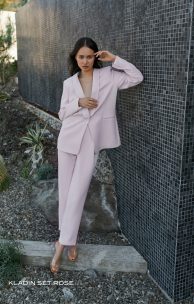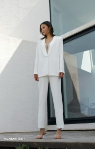 Crepe-Satin-Set. Einreihige Jacke mit einem Knopfverschluss. In Relieftaschen mit „Rahmen“. Schlitze unten an den Ärmeln mit dekorativen Knöpfen. Auf der Rückseite ist Schlitz. Hosen werden nach unten schmaler, Länge 7/8. Falte an der Taille. Taschen vorne abgeschnitten.