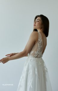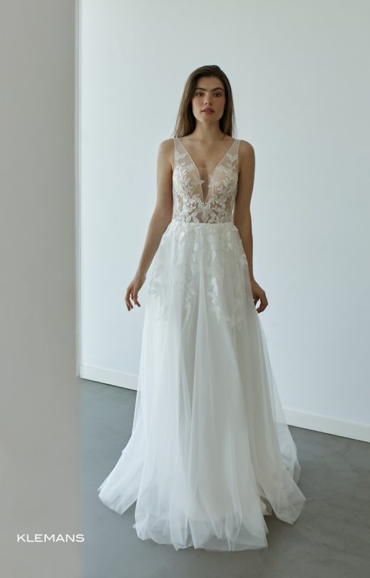 Das A-Linien-Kleid besteht aus Tüll mit Spitzenelementen am mehrlagigen Rock und dem transparenten Oberteil. Rücken mit fallender Taille. Das Mieder wird mit handgefertigter Perlenstickerei entlang des Ausschnitts der Vorder- und Rückseite und der Armausschnitte ergänzt. Auf der Rückseite befindet sich eine Schließe mit Perlmuttknöpfen.