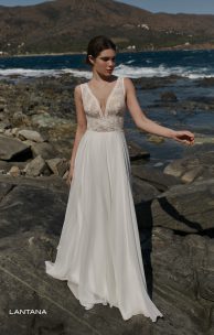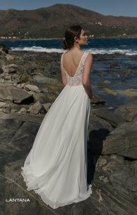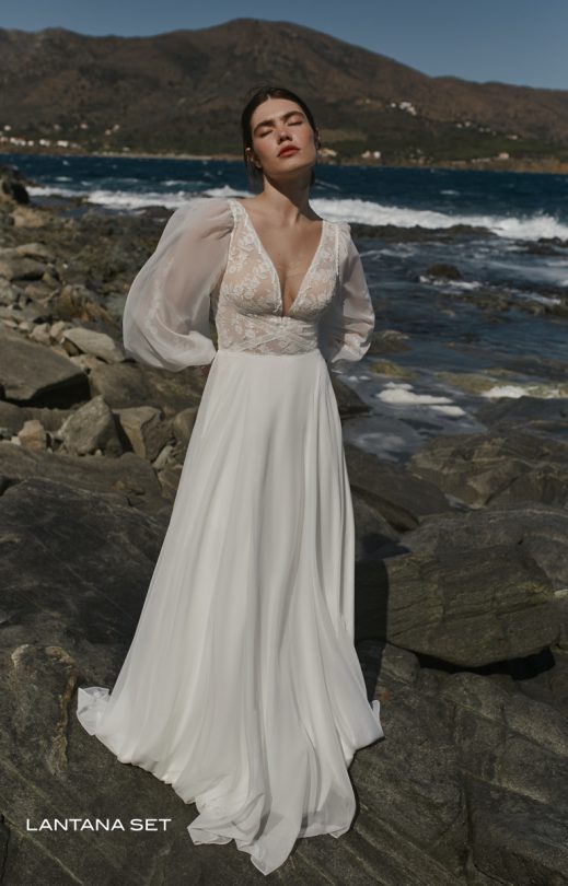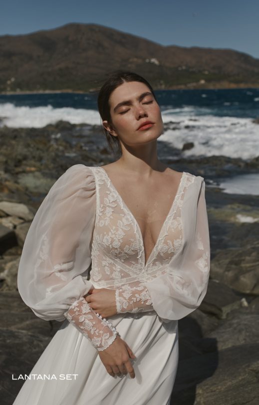 Das Kleid besteht aus Seidenchiffon, kombiniert mit floral bedruckter Guipure und Spitzenborte. Das Mieder ist transparent, ohne Futter. Hinten mit leicht tieferer Taille, Verschluss mit Perlmuttknöpfen. Das Set besteht aus abnehmbaren Ärmeln mit Knöpfen aus Seidenchiffon mit der schmalen hohen Manschette aus Guipure. Die innere Schicht des Ӓrmels ist aus Tüll mit floralen Spitzenelementen verziert. Die Manschette wird mit Perlmuttknöpfen geschlossen.