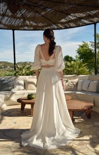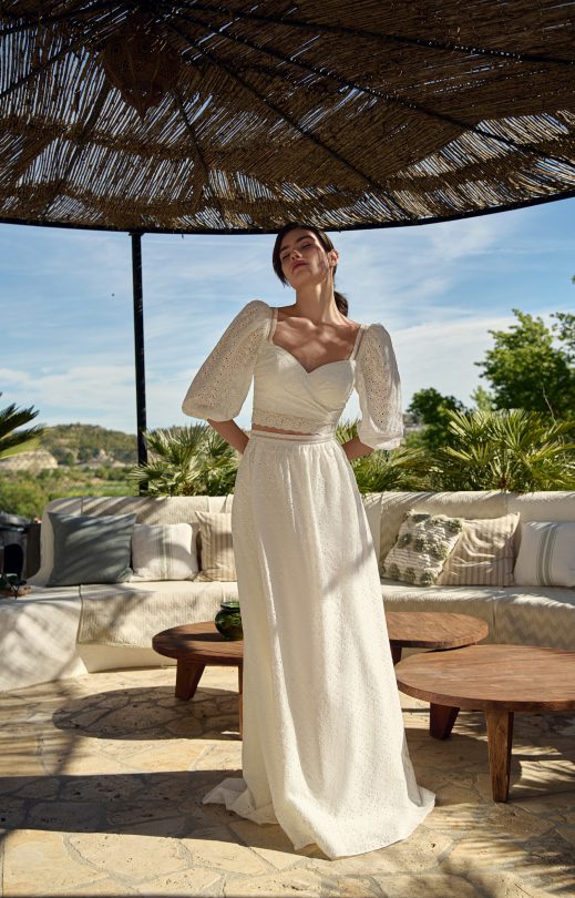 Das Set besteht aus Baumwollstoff. Top mit langen Puffärmeln und Gummizug unten. Unten am Top befindet sich eine breite Spitzenborte. Breite Tüllträger, verziert mit Spitzenborte, verlaufen von vorne nach hinten. Geformter Rücken mit Perlenknopfverschluss. Maxirock mit Reißverschluss hinten, Tüllgürtel in der Taille mit dekorativer Spitzenborte und Verschluss mit Perlenknöpfen.