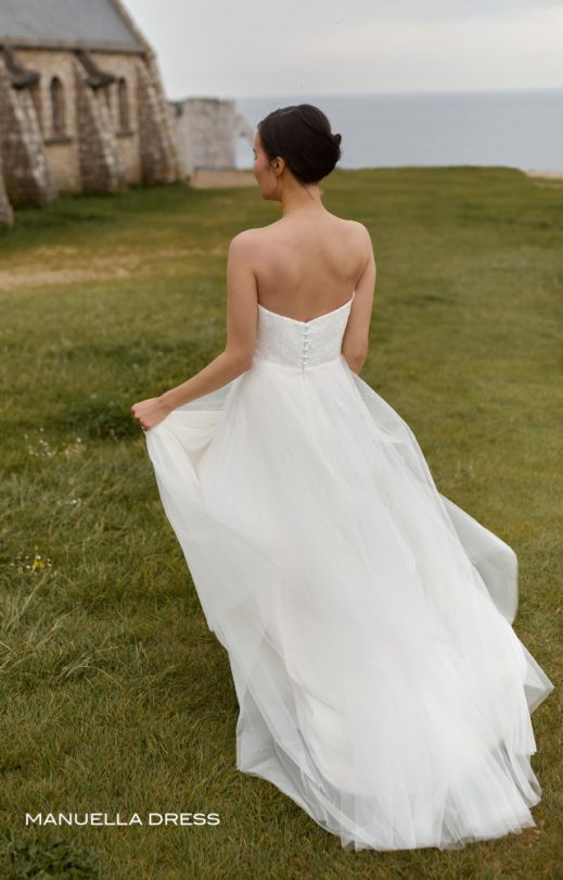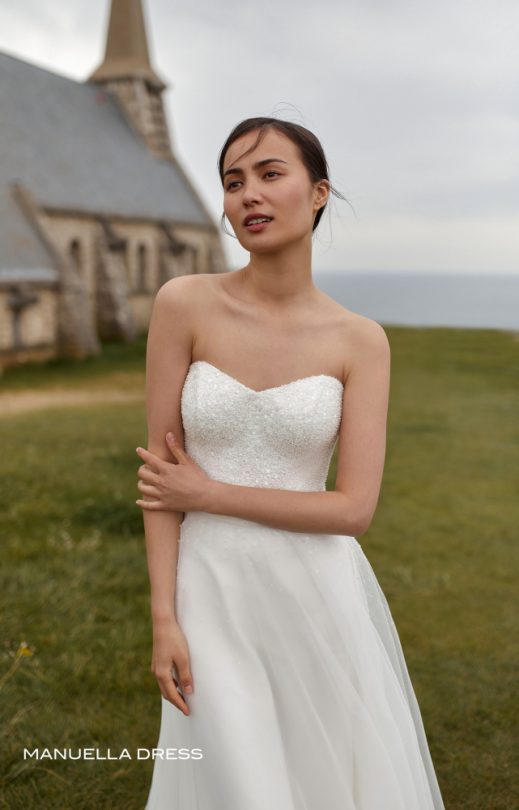 Das Kleid ist aus Tüll und Guipure, dick mit Perlen und Pailletten bestickt. Korsett-Mieder mit Verschluss auf der Rückseite mit Perlmuttknöpfen. Lagenrock oben mit handgefertigter Stickerei mit Perlen und Pailletten. Das Kleid wird mit breiten abnehmbaren Schultergurten mit handgefertigter Stickerei geliefert.