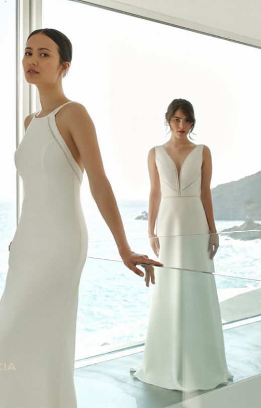 Kleid mit angrenzender Silhouette aus Crêpe-Satin, ohne Naht entlang der Taille. Entlang der Linie des Armlochs vorne und entlang des Rückens befindet sich eine dekorative Borte. Die gleiche Borte ziert die Träger, die vom vorderen Hals bis zum Rücken reichen.