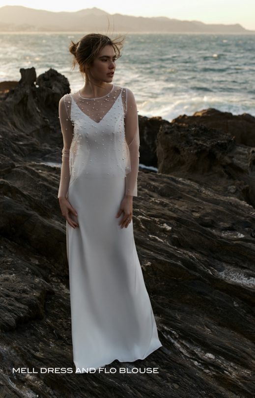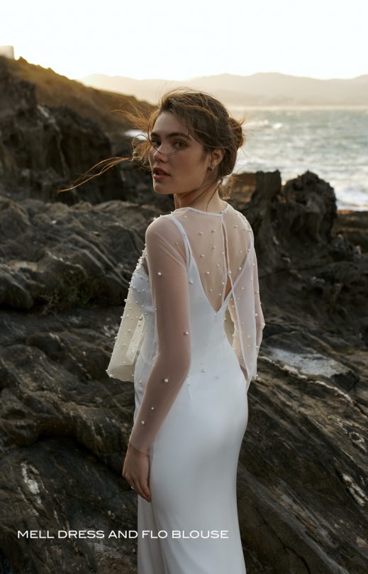 Die Bluse ist aus Tüll, der mit Perlen bestickt ist. Hinter mit Verschluss an 2 Perlmuttknöpfen. Der Ärmel ist schmal, lang.