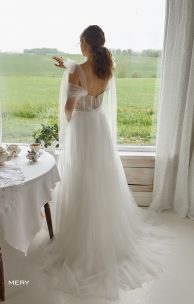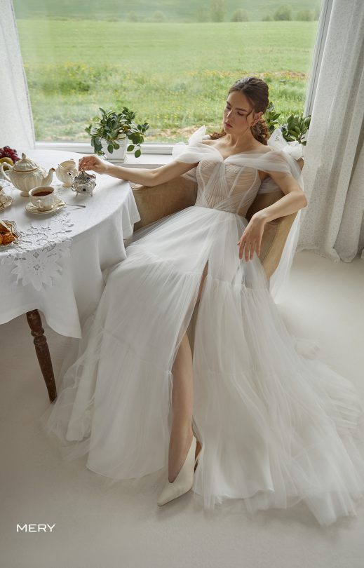Dieses raffinierte Kleid in X-Linie ist aus Tüll gefertigt. Das Mieder-Korsett ist vorne und hinten mit symmetrischen Tüll-Drapierungen verziert. Die Rückseite ist mit einem Tüllband geschnürt. Leichter dreistufiger Rock mit Rüschen. Das Set enthält zwei Arten von Riemen: breite Riemen aus Tüll, die mit Schleifen an den Kleiderbügeln gebunden sind; breite Träger, die in weiche Draperien über die Schultern fallen. Alle Träger sind mit Knöpfen befestigt.