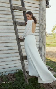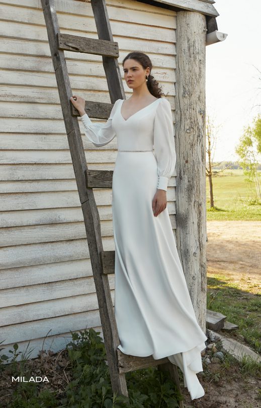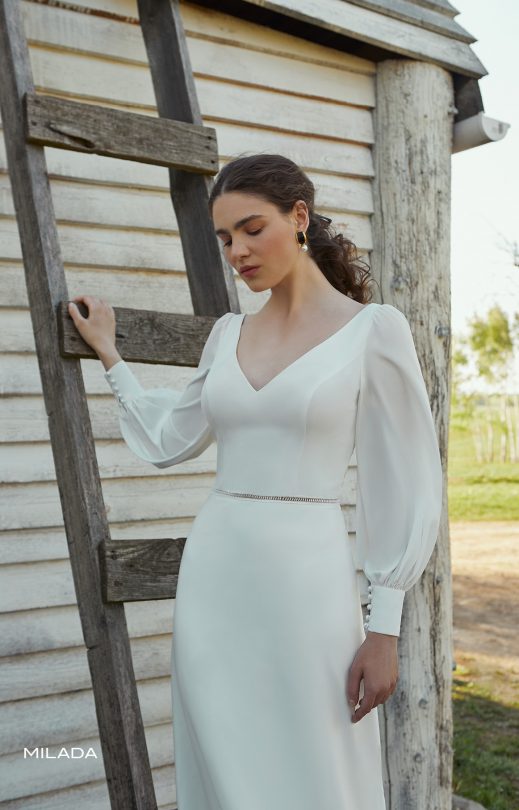 Elegantes Silhouettekleid „Fisch“ aus Seide. Auf der Vorderseite befindet sich ein V-Ausschnitt zur Brustlinie und auf der Rückseite ein lockiger Ausschnitt zur Taille. Oben auf der Rückenlehne befindet sich ein Zierstreifen. Der besondere Charme des Kleides sind die volumetrischen, luftigen Ärmel unten mit Manschetten und Perlenknöpfen. Die Taille wird durch einen dünnen dekorativen Rand betont. Der Rock wird mit der kleinen Schleppe vervollständigt.